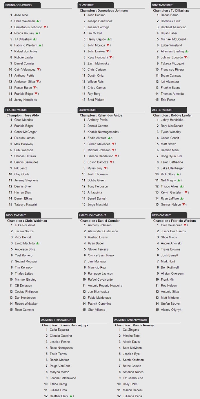 A vitória de Fabricio Werdum por finalização sobre Cain Velásquez na luta principal do UFC 188, que lhe rendeu o cinturão unificado dos pesos-pesados do UFC, catapultou o gaúcho no ranking peso-por-peso do UFC. Antes ocupando a 14ª colocação, Werdum passou a ocupar a sexta posição, ficando atrás apenas dos campeões José Aldo (penas), Chris Weidman (médios), Demetrious Johnson (moscas), Ronda Rousey (galos) e TJ Dillashaw (galos). Já Cain Velásquez, que era o quarto colocado antes da luta, despencou seis posições e passou a ocupar apenas a décima posição na atualização do ranking divulgada nesta segunda-feira.